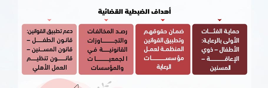 وتهدف الضبطية القضائية إلى الحماية والرقابة، من خلال تعزيز حماية الأطفال في مؤسسات الرعاية، والأشخاص ذوي الإعاقة، والمسنين، وكفالة حقوقهم، ورصد المخالفات والتجاوزات في مؤسسات الرعاية الاجتماعية والجمعيات الأهلية، خاصة تلك التي تشكل جرائم يعاقب عليها القانون، فضلا عن ضمان تطبيق القوانين المنظمة لعمل الوزارة، مثل قانون الطفل وقانون رعاية حقوق المسنين وقانون تنظيم ممارسة العمل الأهلي.