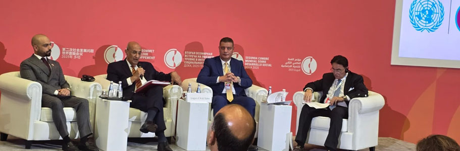 نيابة عن الدكتورة / مايا مرسي وزيرة التضامن الاجتماعي رئيسة المكتب التنفيذي لمجلس وزراء الشئون الاجتماعية العرب، شارك الأستاذأيمن عبد الموجود الوكيل الدائم لوزارة التضامن الاجتماعي في الحدث الجانبي المستوى تحت عنوان " نحو ادماج اجتماعي شامل .. العيش المستقل للأشخاص ذوي الإعاقة والقضاء على الفقر"، وذلك ضمن فعاليات مؤتمر القمة العالمية الثانية للتنمية الاجتماعية بالدوحة.